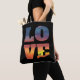 ¡Una playa tropical es el lugar perfecto para el amor! Hermoso efecto de texto knockout en la bolsa con letras apiladas de la palabra AMOR. Una colorida escena de atardecer tropical con palmeras en la silueta se ve a través de las letras en bloque sobre fondo negro.