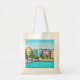 An illustration from a photograph of colourful houses in the Bahamas printed on both sides of a tote bag.