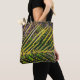 Esta Bolsa de Tote presenta una obra de arte original y abstracta de ZoeSPEAK, realizada a partir de una fotografía original de un frontón de palmeras reclinata. El fuerte sol de Florida resalta las hojas, que crecen de la columna vertebral como rayas en filas diagonales. El césped, con un enfoque suave, forma el fondo verde.