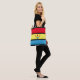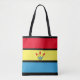 Moderna y elegante, con tres plumas y rayas azules, amarillas y rojas sobre la bolsa de la tote negra.
