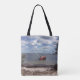 La escena de esta bolsa de la tote es una fotografía original de ZoeSPEAK de un velero en aguas poco profundas. En la foto, el bote rojo se inclina hacia un lado, enmarcado por manglares, una orilla de arena y un gran cielo azul lleno de nubes blancas onduladas.