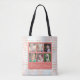 Este bolso es un regalo especial para una abuela. Presenta un collage de fotos de 6 fotos para las fotos de sus nietos. La bolsa está acentuada con un naranja ligero y un fondo a rayas verde azuladas. El texto del personalizado dice: Bendiciones de la abuela