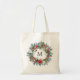 Esta preciosa bolsa de tota color crema de color agua de vacaciones cuenta con follaje de Navidades verdes y ramas de pino, conos de pino, flores de color rojo y crema festivas y bayas de color rojo con su primer o monograma en el centro.