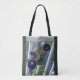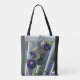 Delicately suspended on a balcony rail overlooking a shingled roof, velvety purple morning glories twine tenderly around a glazed-pottery birdhouse... the gentle textures and hues of this tote will add irresistible springtime charm to any errand. Makes a lovely gift for anyone who loves flowers, birds, or both!