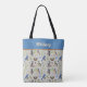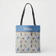 Beautiful tote bag featuring an avian repeat of kingfishers, robins, blue jays, woodpeckers, nests with eggs, and more. Your or your recipient's name appears in a cream color against a color block of robin's egg blue.