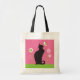 Los amantes de los gatos caprichosos se dan cita en la bolsa para ir a trabajar, ir de compras o a la playa. Un original ilustracion de Mango Moon Studio de un gatito negro elegante mirando una mariposa sobre un fondo con motivos rosas.
