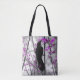 Blackbird en un árbol primaveral reventando con morado en una bolsa de compras de bonitos.