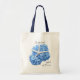 Bolsas de regalo para la fiesta nupcial personalizadas con su nombre y título. Flores de hortensias azules y diseño de estrellas del mar blanco se imprimen a ambos lados de esta bolsa con colores de mango personalizado. El diseño floral, azul claro y realista, tiene una estrella marina blanca envuelta en las flores. Su nombre está impreso en la escritura en la parte superior de la flor con su título - Novia, doncella de honor, niña de flores - en la parte inferior.