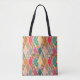 Esta bolsa de tote tiene un diseño Boho de diamantes con diferentes patrones alternando con diamantes sólidos en una paleta de colores de Boho.