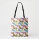 Esta bolsa de tote tiene un diseño moderno de mediados de siglo de boomerang esparcidos por todos lados con segmentos que los atraviesan.