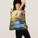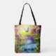 Esta bolsa de tote cuenta con un bosque fantástico con una cascada, mariposa, pájaros y casas de hadas.
