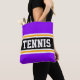 Este diseño deportivo y atlético presenta texto en negrita del TENNIS dentro de una franja negra de centro ancha realzada con pinstripes blancas y amarillas contra rayas exteriores violetas brillantes. El texto se puede personalizar.