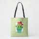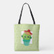 Un tote de hombro con un lindo ilustracion de un cactus verde sentado en una maceta de flores. Grandes ojos kawaii y con sombrero rojo. El fondo es un patrón con movimientos verdes de cal.