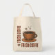 Esta sólida bolsa de tote es perfecta para hacer sus compras de comestibles. Para los amantes del café, este tote cuenta con una foto digitalizada de una taza de café y un platillo marrones. El texto, a lo largo de la parte izquierda y la parte inferior de la bolsa, dice "CAFÉ FRESCO", en un texto la mujer tiene una mezcla de granos de café.
