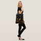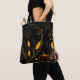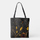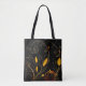 Esta bolsa de tocador muestra un elegante diseño de otoño, perfecto para la temporada de otoño. El fondo negro contrasta maravillosamente con los intrincados remolinos de oro y naranja que se asemejan a las viñas que corren. Estas viñas brotan delicadas hojas en tonos dorados, con ocasionales acentos rojos de flores diminutas y una mariposa florida. Una pequeña calabaza clásica se asienta en la base del diseño, basando la temática otoñal con sus tonos naranjas y rojos profundos. Este tote ofrece un ambiente cálido y festivo, por lo que es ideal para la temporada de otoño o como un accesorio elegante para Halloween.