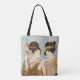 ¡Hermosas bolsas de tote de todo el mundo! ¡Disponible en dos estilos y dos tamaños! Imagen vintage de la vida diaria de un ilustracion que presenta a dos hermosas mujeres, artistas femeninas tradicionales japonesas llamadas chicas de Geisha (geiko o geigi) cuyo trabajo consiste principalmente en entretener clientes masculinos. Actúan como anfitrionas y sus habilidades incluyen interpretar varias artes japonesas como música clásica, baile, juegos y conversación. Una dama sostiene un ventilador y la otra mujer está atando una cuerda alrededor de su muñeca. Se encuentran frente a un fondo floral verde azulado y marrón.
