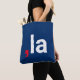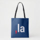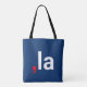 Comma La kamala pronunciación divertida tipografía moderna color blanco rojo y azul patriótico bolsa de tote. Tipografía moderna en rojo y blanco sobre fondo de color editable en azul.