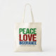Una linda aseguradora de personalizable con una bolsa con letras verdes, rojas y azules que leen Peace Love Insurance. Excelente regalo personalizado para los compañeros de trabajo de su compañía de seguros.