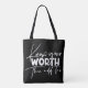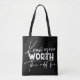 Know Your Worth Inspirador Motivational Quote Tote Bags (Conoce tu valor y agrega impuestos) presenta un guión blanco moderno de caligrafía con el gracioso refrán positivo de "Conoce tu valor". Diseñado por Evco Studio www.zazzle.com/store/evcostudio