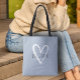 Esta bolsa de mano azul polvorienta está personalizada con tu nombre en una fuente simple sobre un gran corazón blanco. Ideal para ti, para tus damas de honor, club de lectura, regalo de graduación, regalo de cumpleaños, regalo de maestro o cualquier ocasión. MÁS colores en nuestra tienda.