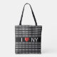 Patrón rayado de corazón y blanco en la bolsa de tote negra.