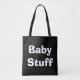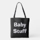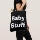 Esta bolsa de pañales dice 'Cosas para bebés' en letras blancas en una bolsa de tote negra que es apropiada para mamá o papá.