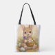 This cute Easter bunny tote bag features an adorable baby rabbit holding a basket filled with colorful pastel Easter eggs. Surrounded by soft spring flowers and warm tones, this kawaii design captures the joyful spirit of Easter.