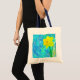 Esta bolsa de tetas muestra un collage digital compuesto por varias capas de pinturas, texturas y escaneos. El soleado daffodil "sopla" de fondo azul.