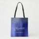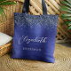 Esta elegante bolsa tote para dama de honor moderna presenta un borde de lentejuelas azul marino. Agrega su nombre en escritura a mano blanca y la palabra "dama de honor" u otro título en fuente sans serif sobre un fondo de metal cepillado azul.