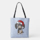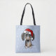 Esta bolsa de tote festiva incluye un encantador dibujo personalizado de un merle dapple dachshund con un brillante sombrero rojo de Santa. Personalizar con nombre u otro texto. ¡Hace un regalo divertido para los Navidades para las mamás y papás doxie de los perros!