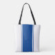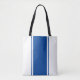 Este diseño moderno y nítido presenta una amplia franja central vertical azul profunda realzada con rayas de carreras flotantes en un fondo blanco brillante.