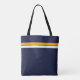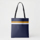 Esta moda, de diseño deportivo, presenta un fondo azul marino con dos delgadas rayas de carreras blancas horizontales de borde superior y amarillas doradas.