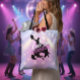 Bolso de despedida de soltera de disco divertido diseñado para el equipo de la novia. En hermosos colores graduales desde lavanda hasta periwinkle y rosa con una bola de discoteca funky, silueta de vaquero domando un bronco, fuente retro glamorosa "Bride 'em Cowboy" (el equivalente country de 'ponle un anillo') y un fondo de luces de discoteca. Busca ID928 para ver otros productos de esta colección de moda.