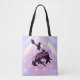 Bolso tote divertido de despedida de soltera con temática disco diseñado para la novia y su equipo. En hermosos colores gradientes que van desde el lavanda hasta el periwinkle y el rosa con una bola de discoteca funky, una silueta de vaquero domando un potro, fuente retro glamorosa 'Bride 'em Cowboy' (el equivalente country de 'ponle un anillo') y un fondo de luces de discoteca. Busca ID928 para ver otros productos de esta colección de moda.