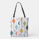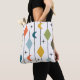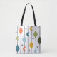 Esta bolsa de tote tiene un diseño moderno de mediados de siglo de líneas verticales con diamantes y boomerangs, con starburst esparcidas en el fondo.