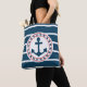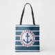 Diseño náutico con decoración de ancla en forma redonda sobre fondo rayado azul y blanco