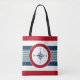 Diseño náutico con decoración de brújula en forma redonda sobre fondo rayado azul, rojo y blanco