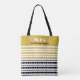 Elegant tote bag customized with the name "Mariah Jane Sanders" and the initials "M.J.S". Modern gold, black and white geometric pattern design with diamonds and heart shapes creating a visually interesting and striking effect.