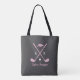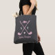 Looking for a stylish personalized golf tote bag for women that doesn’t get lost or look boring? This chic tote bag features bright pink golf clubs with white bows, a matching golf hat, and a crisp white golf ball on an elegant gray background. Customize it with initials and a full name for a polished, personal touch.