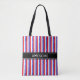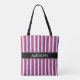 Elegante rayas verticales rojas y azules Tote Bag. Las franjas azules tienen un patrón de estrella blanca. El texto se puede personalizar. Hermosas mujeres de moda Tote Bags. Bolsas de compras. Bolsas de comestibles.