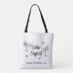 Bolsas blancas de tote lindas y femeninas para tu fiesta de despedida de soltera con bocetos de chicas glamorosas tomando el sol en copas de martini de cóctel, estrellas retro, "Babe Squad" en una fuente retro de moda y la ubicación de la fiesta u otro texto en letra simple y moderna.