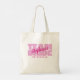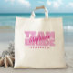 Diseño personalizado de bolsa de mano para la fiesta de despedida de soltera con "EQUIPO NOVIA" en tipo rosa claro y negrita. Personalice el nombre de la dama de honor en escritura rosa oscuro brillante coordinada. El título o texto personalizado aparece debajo. ¡Todos los colores de este diseño son personalizables en la herramienta de diseño de Zazzle! El diseño se repite en la parte posterior.