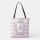 La esta bolsa de asas hermosa ofrece un escudo de la acuarela con su inicial, y la acuarela de moda florece rodeándola. Las rayas rosadas de la acuarela llenan el fondo. Hemos utilizado arte de LABFcreations.