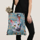 Un gato de ojos coloridos se sienta junto a una elegante bolsa de tote a cuadros con la frase "Ellos esperan su satisfacción".