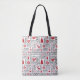 ¡Feliz Navidad con bolso de té en rojo, blanco y negro con árboles de vacaciones, ornamentos, renos, mitones, dulces!