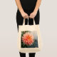 Entre las maravillas de la naturaleza, las dahlias son una increíble familia de flores, muchas formas, colores y tamaños. La fotografía original de MaeFlowers en esta bolsa de la tote muestra una flor asombrosa en plena flor, una esfera de pétalos de color melocotón, flotando en el aire.