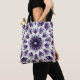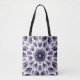 Bolsa de mantalala de flores con un patrón caleidoscópico creado a partir de una acuarela y un dibujo de tinta de una flor de loto abstracta en azul, violeta y negro.