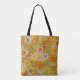Esta bolsa de tote tiene un patrón retro floral en tonos verdes, rosas, naranjas y amarillos inspirados en los diseños de los años 60 y 70.