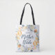 Fiesta de novias personalizadas con las bolsas personalizadas con la madre del nombre de la novia u otro texto personalizado. Este elegante diseño femenino tiene una corona floral acuarela con polvorientas flores grises azules y amarillas turquesas. Utilice las herramientas de diseño para personalizar cada monograma, elija cualquier color de fondo, edite fuentes de texto y colores y agregue fotos para crear una especie de bolso de tocador para los regalos de tu fiesta de boda.