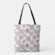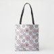 Esta bolsa de tote tiene un diseño moderno de mediados de siglo de flores hechas de círculos en tonos rosas, arándanos y beige y líneas negras.